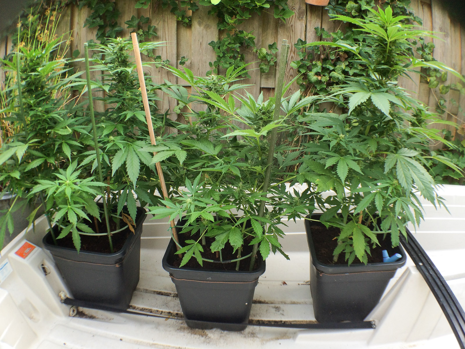 Vijf en een halve plant in 3 stuks 18 liter potten op zonnige dagen in de zon (bootje) en bij regen beschut onder een afdakje.