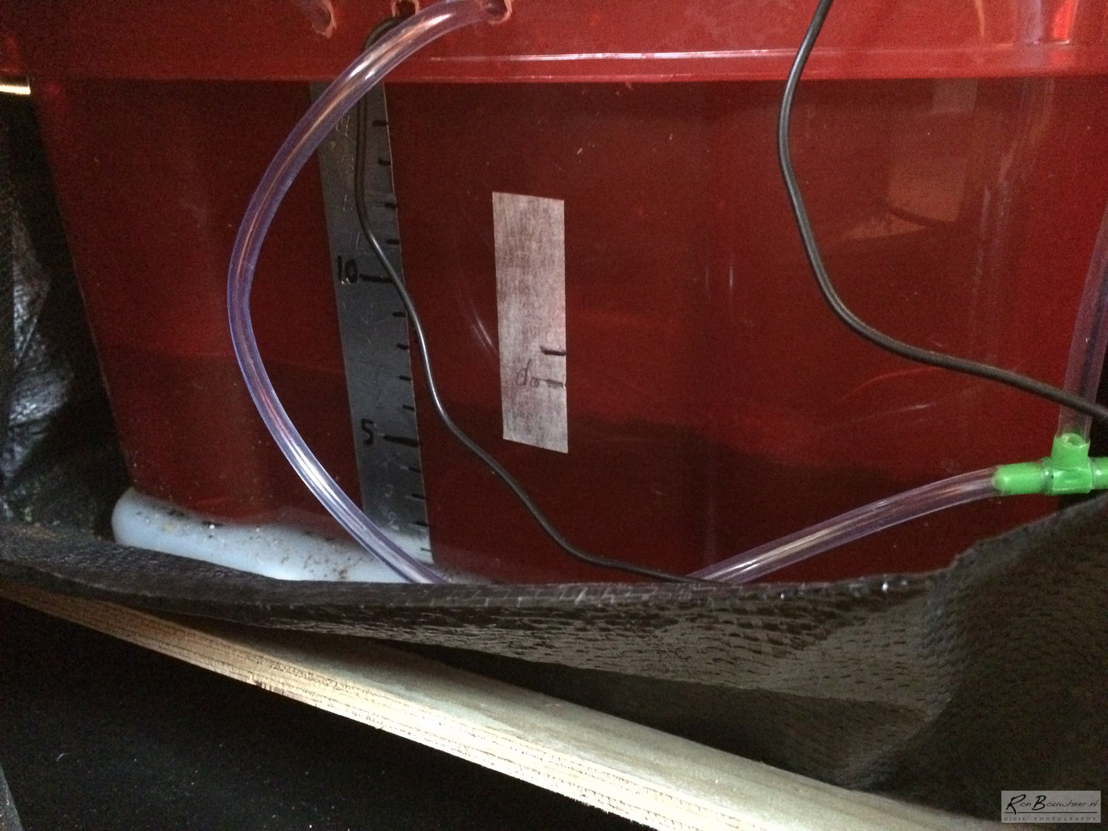 Het word steeds lastiger (en zwaarder) om de waterbakken te controleren, de potten moeten immers omhoog met een lekbak eronder. Om de wortels zo min mogelijk te beschadigen heb ik een systeempje bedacht met een houten rekje op de lekbak waar de pot 'inhangd', dit werkt al beter. De potten hangen nu 5-6 cm boven de bodem met de luchtsteentjes eronder. De hoeveelheid water in de bakken aangepast naar ca. 10 liter (=10 cm, zie foto 1), de potten hangen dan ca. 1-2 cm in het water (ze zouden nog beter net boven het water mogen hangen). De extra geboorde 5 mm gaatjes in de pot komen 4 cm boven waternivo, zodoende kan de aarde beter ontwateren en lucht bij hydrokorrels. Achter het isolatieschuim bij de luchtinlaat kan ik nu de plastic 'lade' iets uitschuiven zonder de plant te verplaatsen voor controle en Ph-meten e.d. Met een schaalverdeling in liters kan ik nu gemakkelijk het waterverbruik controleren aan de voorzijde van de transparante bakken. Toch zal af en toe de plant eruit getild moeten worden bij verversen e.d., best wel een klusje. Gelukkig heb ik een scroggaas per plant!